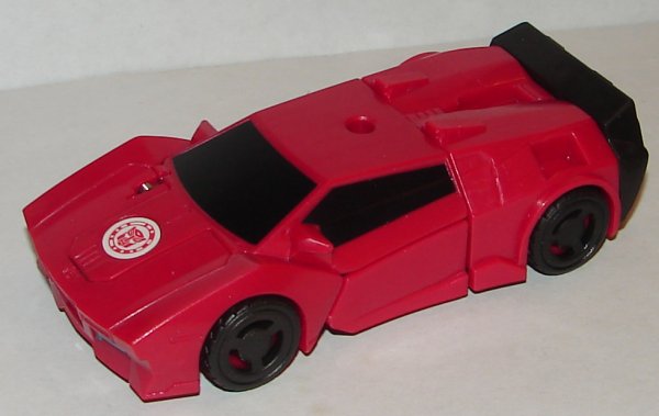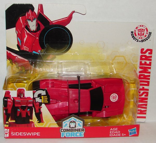 Oh good. Another new mold One Step Changer Sideswipe. I was worried we weren’t going to get another one. One Step Changers of different characters are fine, but I am getting tired of getting the same ones over and over. It’s not a bad toy, and has an interesting transformation I don’t think we’ve seen before. The back part of the car, expect for his feet spins 180 degrees and transforms him.