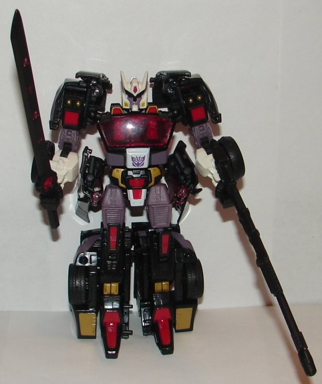 I never did a review of the original drift, but I recently reviewed Blurr. Deadlock was not originally on my list of toys to pick up, but he has such an amazing paint job. Black and purple looks great on this vehicle mold. They really went all out on the details. They even painted the symbols on his sword. My minor complaint about him is that they gave him both Drift’s sword and Blurr’s gun, so you can only store one of them on the bottom of the vehicle. Not sure he really needed both, as he also has the small guns that came with Blurr. Deadlock is very cool, though I don’t think he is worth the $80 that he’s going for on eBay. I paid $60, probably still a little high, but not bad.