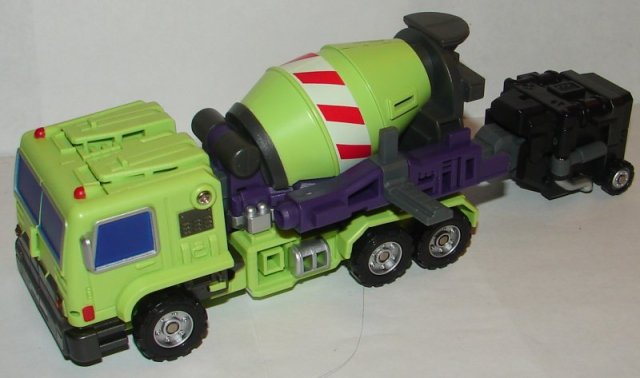 You’ll notice that Mixmaster has a little trailer. That is one of Devastator’s forearms and hands. Scrapper pulls the other. I think that was a very clever way of incorporating them into the vehicle modes. Mixmaster is my favorite of the vehicle modes. My only complaint, and it’s a small one, is that you can’t actually spin his tank. In robot mode he can carry both of Devastator’s forearms like a back pack. He also has a door over his head that opens to reveal two missiles. His robot mode looks great. He’s probably the best of the set.