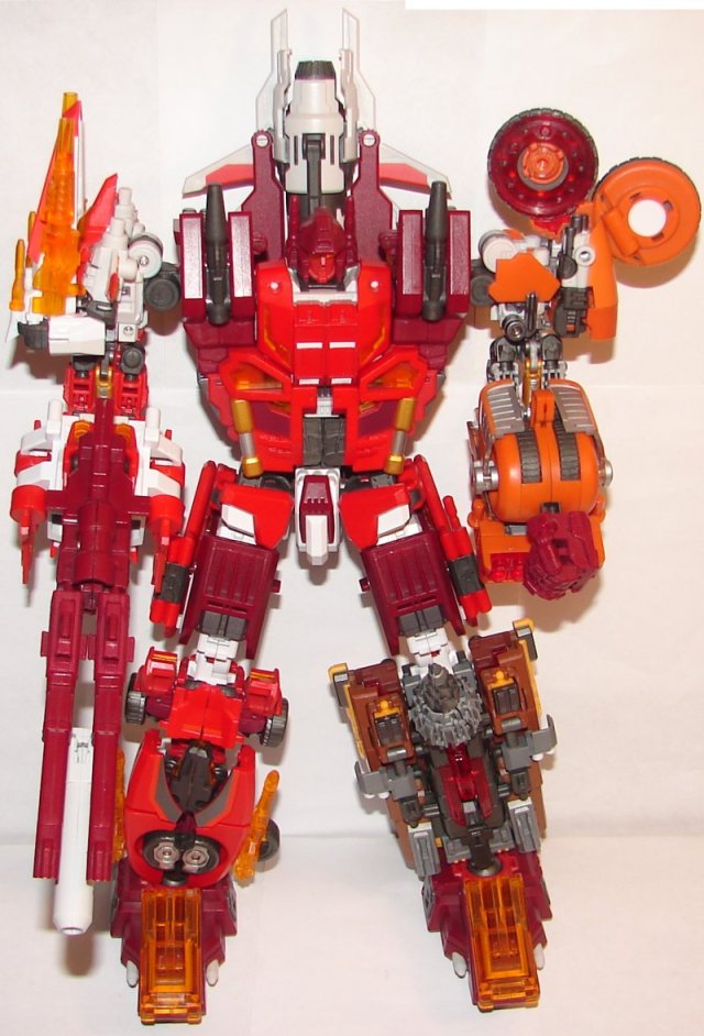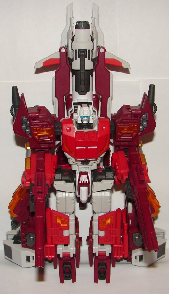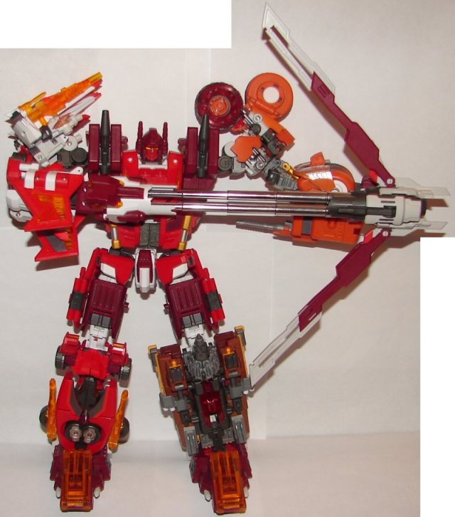 Computron is awesome. His head seems a little small, but other than that, he looks perfect. He has a bunch of different weapons configurations. He has his gun, which is made of both of Scattershot’s guns plus a couple of other parts. He can strap the front of Scattershot’s jet mode onto his arm as a cannon. The cannon can also be converted into a crossbow. Finally, the crossbow can convert into a bow and arrow. That’s pretty amazing design. Whoever designed this should be working for Hasbro. Actually, Hasbro is probably beneath their skill level. Maybe they should work for Takara and design some Masterpiece combiners?