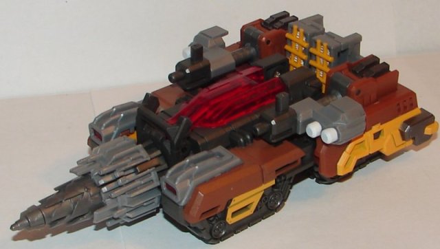 Nosecone’s tank mode is awesome. I love some of the details like the lights on the back. If he is supposed to be drilling into the ground, he would need some light. He does not have any separate weapons, but he does have cannons on each side that are built in. In robot mode the cannons fold up under his forearms for use in robot mode. The treads on the inside of his legs makes it so you can’t stand him up straight. I hate having to pose him with his feet apart. I love the colors, he really looks great.