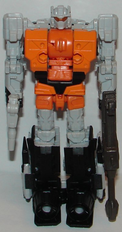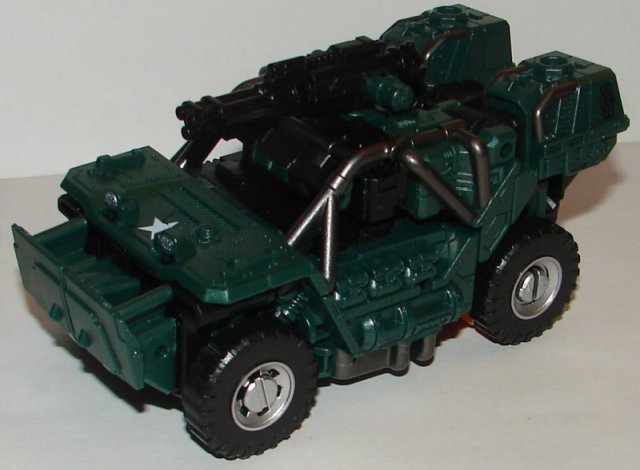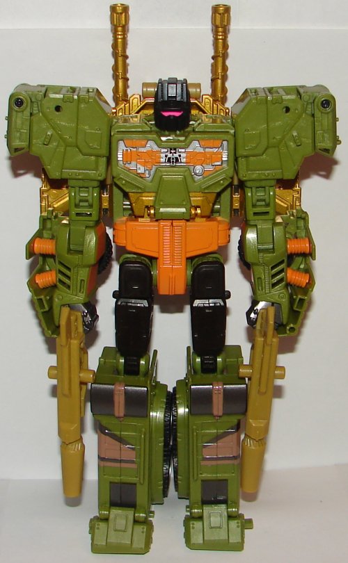 So, Greejeeber is a little darker green than Hound, and loses most of the paint apps from Unite Warriors Hound. In robot mode he has an orange chest like the original toy did. He includes the gun from Unite Warriors Long Haul.