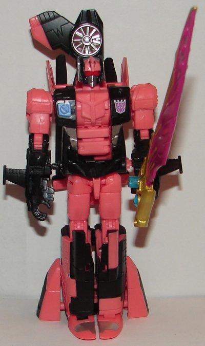 I love the black and purple color scheme on Flowspade. While the pink plastic does not match the pink paint perfectly, it’s a thousand times better than most Hasbro toys match the paint to plastic. It should be noted that this is now the 13th use of this mold. I am not certain, but I think that might make this the most repainted Transformer ever. I can’t think of any other one repainted that many times. I have a sneaking suspicion we are getting one more of this mold.