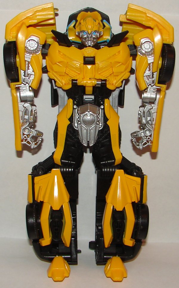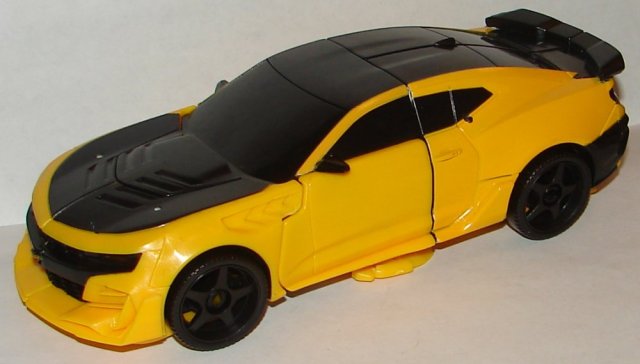 I really like Bumblebee’s paintjob in car mode. The black roof really looks great. Unfortunately, that’s where the good about this toy ends. In robot mode he is one big design flaw. When he transforms it’s in just a two steps. His legs and arms swing out to the sides and then down into robot mode. The problem is, the mechanism leaves his legs resting on hinged parts that are at an angle to the bottom of his feet, so gravity wants to pull his legs back into car mode. He does stand up, but his legs are permanently bowed. It’s really too bad. After some less than stellar toys like this for the Age of Extinction Flip & Change line, the Robots in Disguise Three Step Changers are actually pretty good looking for the most part. Some of them are excellent. This is a step backwards in design. The “Knight Armor” gimmick is nothing put a spring released helmet that flips onto his head.