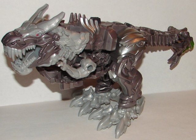 Grimlock looks like a cheap knock off version of the AOE Flip & Change Grimlock, except they changed the mechanism. Instead of splitting his tail and flipping him, his tail just flips up to transform him. The box says he transforms in three steps, but as near as I can tell, one of those steps is turning his feet out and then back without any actual reason to do so. I think I deleted my picture of him without the armor helmet, but it doesn’t make the toy any better.