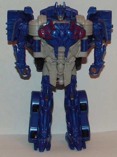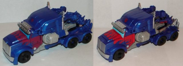 Optimus Prime is a repaint of AOE One Step Changer Optimus Prime. It’s essentially the same paint job except for the chest, they just used darker red paint. They also appear to have used slightly lighter gray plastic, though that could just be the photo.