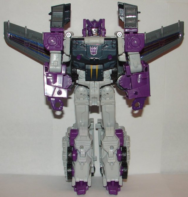 Let’s start with the name. This isn’t the first time they have not used the name Octane. I am not certain why. I believe that octane is not a trademarked word. They should have been able to use Decepticon Octane. The name Octone is a pretty meaningless. As to the toy, he looks amazing. He has a number of mold changes from Optimus Prime. His truck mode is unchanged, but he has new wings and a new nose in jet mode. In robot mode he has a new chest and abdomen (the button that releases the sides of his head). He also has new front on the pieces sticking up from his shoulders. Unfortunately, as great as he looks, he has a couple of design flaws. One is that you can’t swing his arms up at the shoulder and out straight in front of him. The height of his shoulders is the issue. You can only swing his arms up to a certain point until they hit his wings. As I am not really that concerned with articulation, this is not a big deal, but is something they should have addressed when he was designed. The other issue is the port on his wings that plug into his back in robot mode. It is not deep enough, and his wings tend to pop out and droop down. This is unforgivable. There is no excuse for that.
