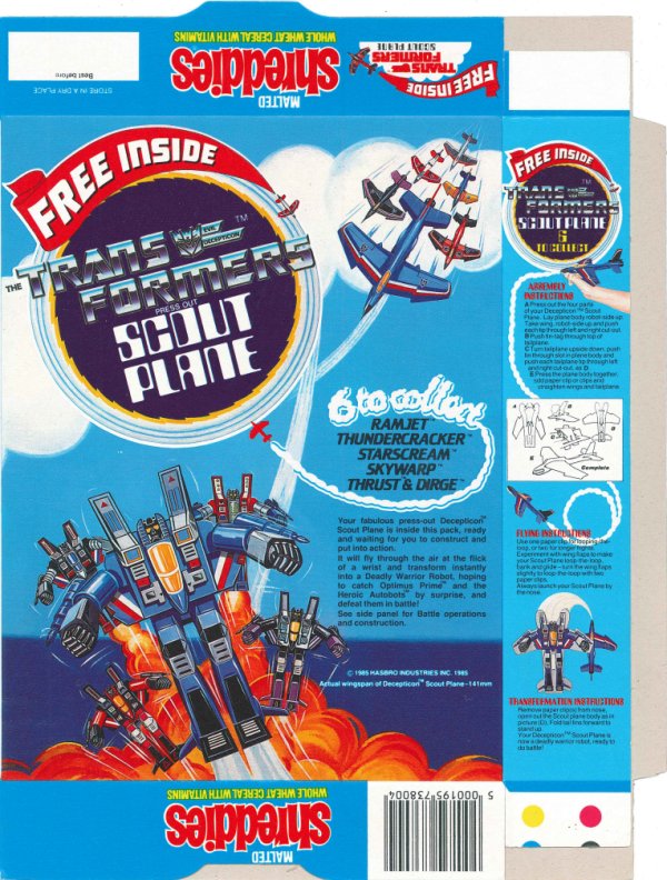 In 1985 Nabisco ran a Transformers promotion with Shredded Wheat and Malted Shreddies cereals (could be others?). The boxes included one of six Scout Planes. As I don’t have any of the Scout Planes, I don’t know much about them. I imagine they were either cardboard or foam. They could be assembled in plane or robot modes. Starscream, Skywarp, Thundercracker, Dirge, Ramjet, and Thrust were available.