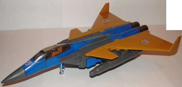 This is the seventeenth version of the Masterpiece jet mold. I’m not going to go into detail on the mold as I have done so many times. For more info please see my previous reviews of Masterpiece Starscream (Japanese, MP-11), Masterpiece Thundercracker (USA), Masterpiece Acid Storm (USA), Masterpiece Sunstorm (USA), Masterpiece Skywarp (Asia, MP-11SW), Masterpiece Starscream (USA), Masterpiece Thundercracker (Asia, MP-11T), Masterpiece Ramjet (Japanese, MP11-NR), Masterpiece Sunstorm (Japanese, MP-11S), and Masterpiece Thrust (Japanese, MP-11NT). In the photos he is pictured with Starscream (MP-11), Thundercracker, (MP-11T), Skywarp (MP-11SW), Ramjet (MP11-NR), and Thrust (MP11-NT).