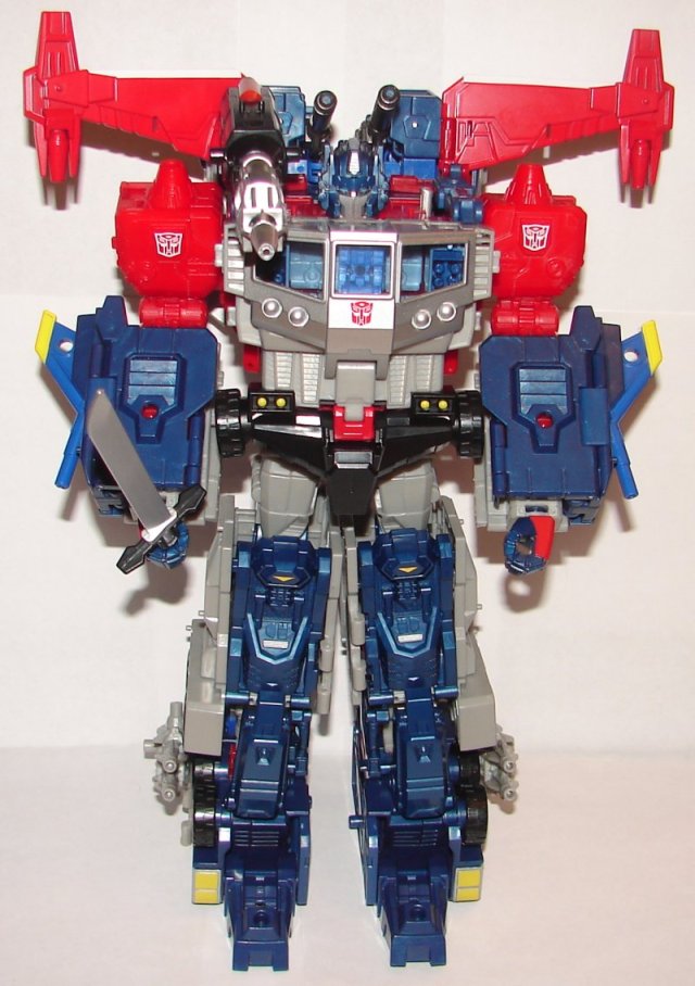 Combined Mode: In combined vehicle mode, the connector to attach Godbomber to Ginrai is a joke. You have to separate Ginrai’s feet to insert the connector, but it is then very hard to get them closed again so they are holding the connector in place. I couldn’t do it. In the photo, Ginrai’s feet are not properly pegged together. I don’t know how you get this connected without two people. In robot mode he looks beautiful, though I am disappointed that he does not have a chrome chest. (Perhaps in the gift set?) The instructions for combining them are terrible. Unfortunately, he has an unforgivable design flaw.
