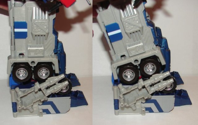 Vehicle Modes: His base mode is fine, but it’s nothing special. I love the look of his truck/trailer mode. He looks like Godbomber. He even has room for three Headmasters inside like in the Japanese cartoon. Unfortunately, this is a horribly designed toy. The top of the vehicles (his robot arms) don’t stay on very well. They peg in, but not very snugly. He will start to come apart if you grab him the wrong way. It’s just poorly designed. The joint that allows his gun to move up and down has no tensions to it, so you really can’t point the gun up at an angle. His wings aren’t pegged in place and move very easily. Takara is usually better than this.
