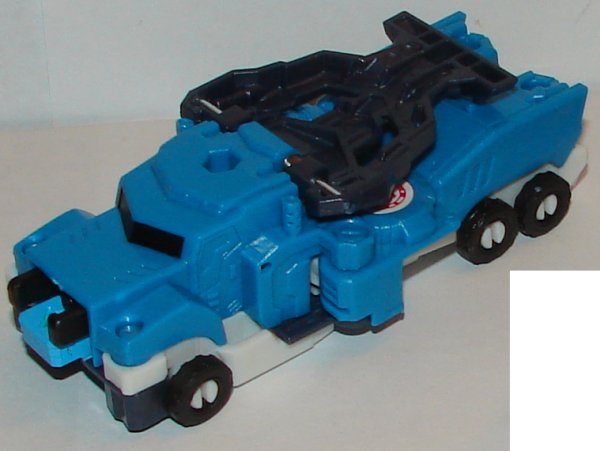 Vehicle mode isn’t bad. If they had just painted his chest window light blue in robot mode, he would look pretty good, but the all black torso looks lousy.