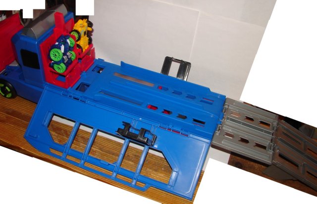 Optimus Prime’s trailer unfolds into a short race track with a built in launcher. You stand up two Flip Racers as shown and then push down on the red post to set the mechanism. You then push down on the gray bar it tilts them forward and trips the launchers as they transform into vehicle mode. The track is only a couple of feet long and then they just go across the ground. Pretty cool.