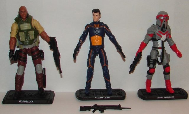 Roadblock, Action Man, and Matt Trakker. Since when is Matt Trakker black? Whatever, I don’t care. I don’t collect any of these lines, and none, save maybe Roadblock, belong in a box with a Transformer. The figures are fine I guess. For some reason, Roadblock comes with two knives, but only has a sheath for one.