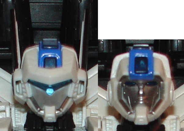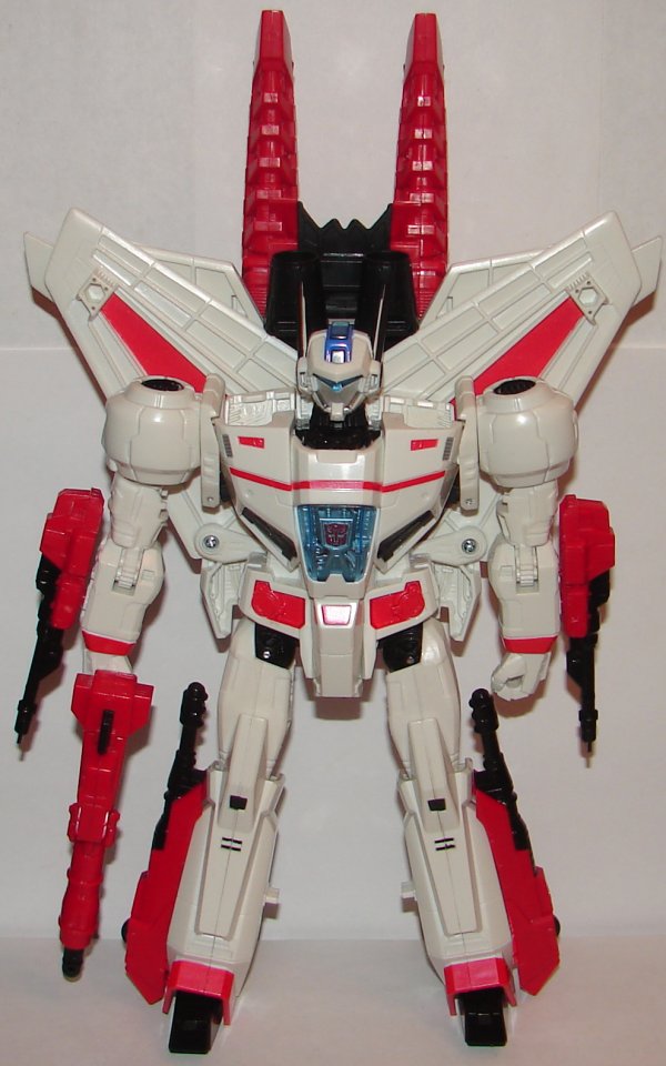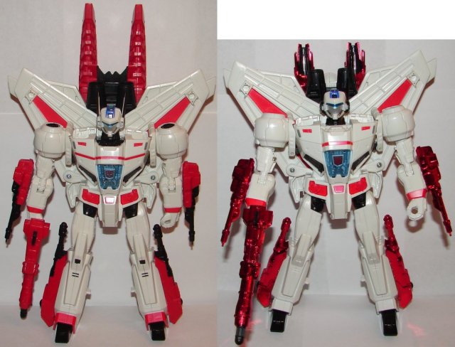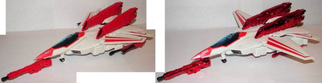 Jetfire is a slight repaint of the original version. His chrome weapons are now red and black. While I liked the chrome, he looks great in these colors. He has some additional paint apps on his ankles and knees. The red Stripe on his chest goes all the way across on this version. They also did a better job of painting the Autobot logo on his chest.
