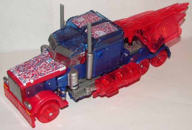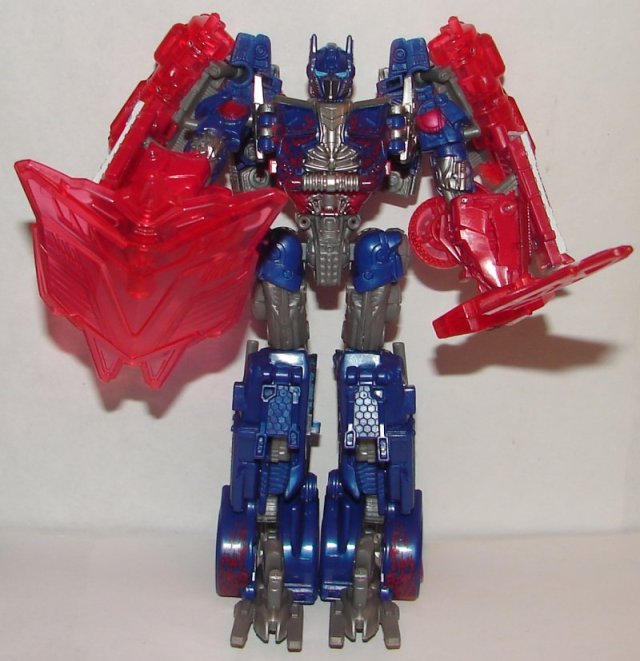 Vehicle Mode: Optimus Prime is a repaint of the Dark of the Moon Voyager Optimus Prime with a new set of weapons. I’ve never done a full review of this mold. I love his vehicle mode. Unfortunately the paint job on this version has a lot to be desired. He has paint apps that are meant to be revealed when you look through his sword and shield. It’s not very well executed. First of all, it looks like crap. They didn’t have to do it on his whole roof and hood. They could have just done a logo shaped area with the logo revealed in it. Second of all, his sword and shield do not have enough flat untextured area to really look through without distortion. Lastly, the translucent red wheels just don’t work. I don’t mind it so much on his fuel tanks. If they wanted to do him all in translucent plastic, I would be all for it, but just the wheels and fuel tanks doesn’t really work.