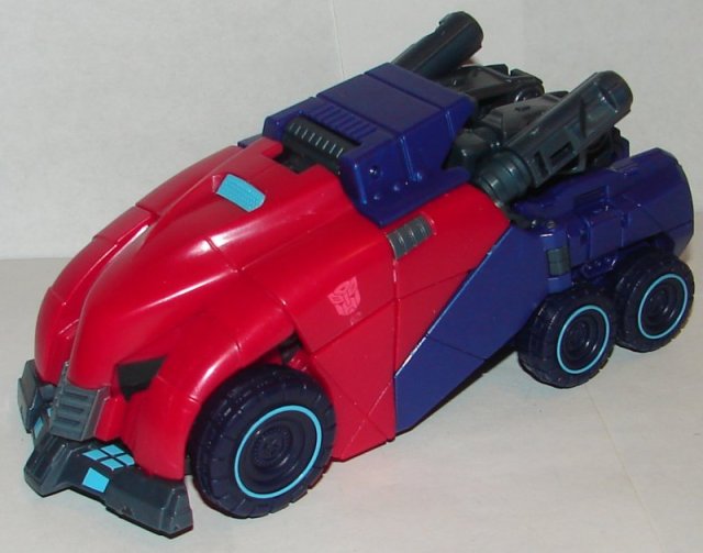 Vehicle Mode: I’ve never done a full review of this mold. Optimus Prime is based on the War for Cybertron video game. I really like his vehicle mode, a Cybertronian armored vehicle. His “windshield” is very small, so compared to a human he’s supposed to be massively large. A human wouldn’t even come up to the hubcap of his front wheel.