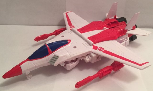Jetfire is a heavy remold of Cyber Battalion Starscream. Starscream was basically an upsized Legends Starscream. I really like Jetfire. When I heard Starscream was being remolded into Jetfire, I assumed he would get a paint job and a new head, but almost his entire jet mold in new, including his wings, which now look right for Jetfire. His head and chest have also been remolded.