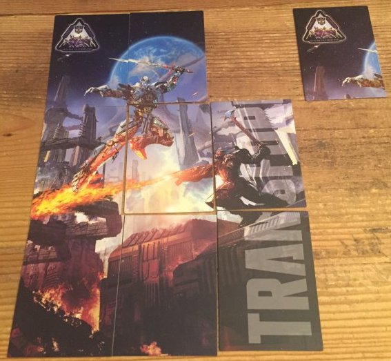 Back in June Hasbro started releasing the Toys R Us Exclusive Mission to Cybertron toys. There were seven toys in the series. Five of those toys contained a single trading card. The other two contained two training cards, those being the Optimus Prime Deluxe 2-Pack and Supreme Class Cybertron. Over the course of a few months the toys came out. As I got them, I just tossed the cards in a pile and didn’t really look at them. The cards are a puzzle, so there wasn’t much to do with them until I had the all to scan the picture.