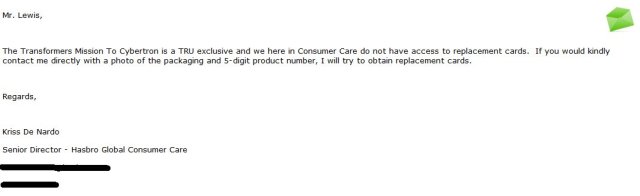 I have had Hasbro Customer Service out and out lie to me before, also about a store exclusive that they sad they could absolutely replace. I got two random toys that did me no good and had to shell out another $50 to buy the toy again. Fucking thieves. I still have those two damn toys in a box eight years later.