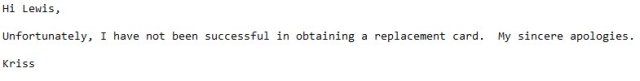Didn’t even offer me a coupon, and I bet Kriss would never have bothered to respond at all if I hadn’t sent that e-mail. What’s worse, Kriss apparently didn’t even bother to read my complaint. What I wanted was information. I wanted to know if the card was never produced. After selling me a defective item, the least they could do is put me in touch with someone who could actually get me an answer to the question.