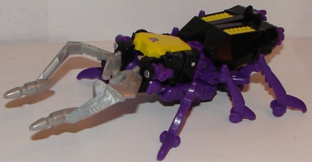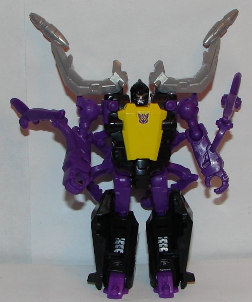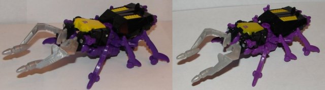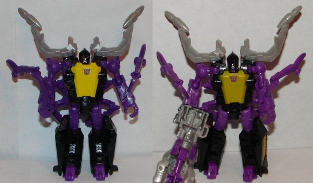 Read my review of the original version of Skrapnel here. This time he does not come with his partner, Reflector. Hasbro stated that this version was unchanged from the original release, so of course he is different. This is the same thing that happened with Cosmos. This new version of Skrapnel has lighter purple plastic and lighter yellow paint.