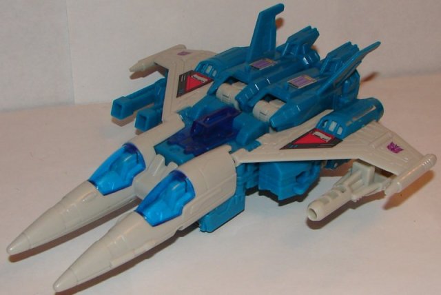 Slugslinger completes the trio of Decepticon Targetmasters, and he does so perfectly. Hasbro did a great job on all three of these toys. His remolded chest looks great, I love the head sculpt, and his wings and cockpit look great. They even painted the face and eyes of his Titan Master. (If only they had started doing that from the beginning of the line.) The one thing I don’t like is his weapons. While I am not a big fan of the guns that clip together to form a seat for a Titan Master, the jets benefit from them as they can put one under each wing. Slugslinger’s gun is two pieces. One regular gun and the other that contains the seat. This is fine in robot mode where one plugs in on top of the other, but I hate having jets with different weapons under each wing. Other than that, he’s perfect.