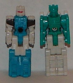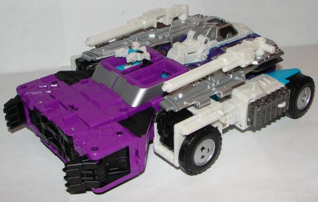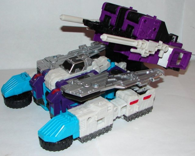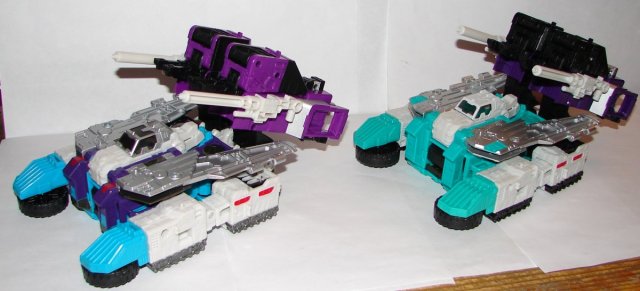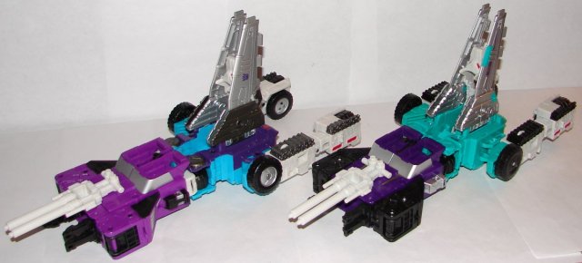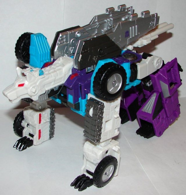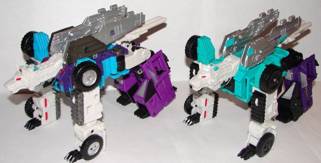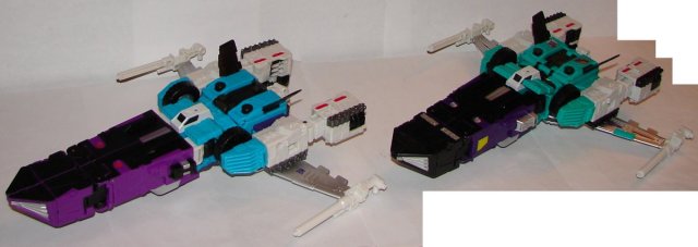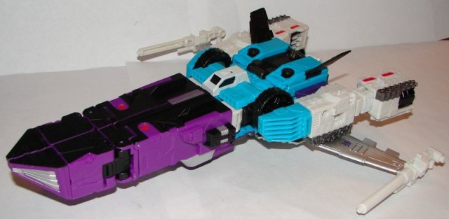 Headmaster Sixshot is a completely new mold. His robot mode is made to look like a miniature Sixshot. His new face sculpt looks great. Not sure about the weird thing on his forehead, but you can’t see that when he’s combined anyway. One interesting thing, the Japanese version is just white plastic. The USA version was painted. I kind of wish the Japanese one was painted.