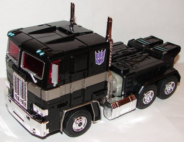Stupidly, I never bought Black Convoy when he first came out. I later discovered that he had a mold change from the original MP-10, which I should have realized. They remolded his left shoulder to remove the raised Autobot logo, replacing it with a Decepticon tampoed logo. I was glad they reissued him, as the original was getting pretty expensive. Black Convoy looks great in black silver, gray, and teal with red windows. It’s kind of disappointing that they did not release him with the black trailer.
