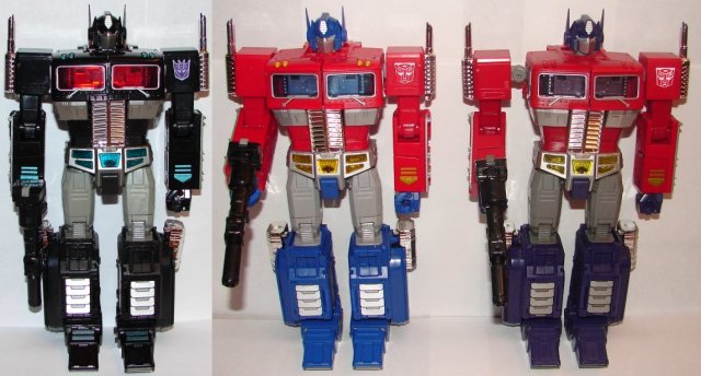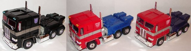 All photos below show (from left to right) Black Convoy, Toys R Us Exclusive (2012) Masterpiece Optimus Prime, and Masterpiece Optimus Prime (MP-10).