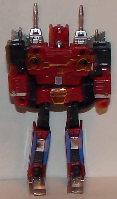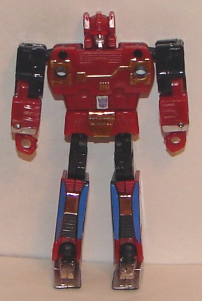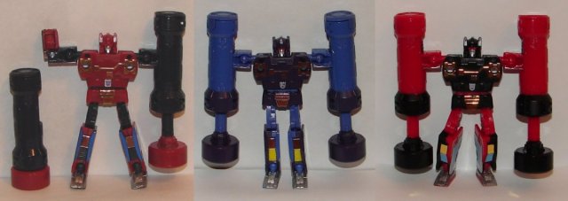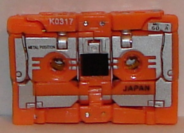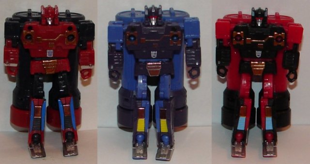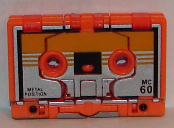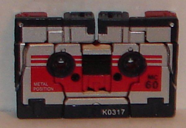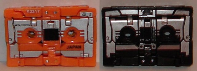 Enemy is a repaint of Frenzy and Rumble. Stripes is a repaint and remold of Ravage. Wingthing is a repaint of Ratbat. Nightstalker is a new mold. Read my reviews of Frenzy, Ratbat, Ravage, and Rumble. This set is based on the cassettes that came with Encore Soundblaster and Twincast. The original inspiration for Enemy’s color scheme and name was the Generation One AM Radio & Headset.