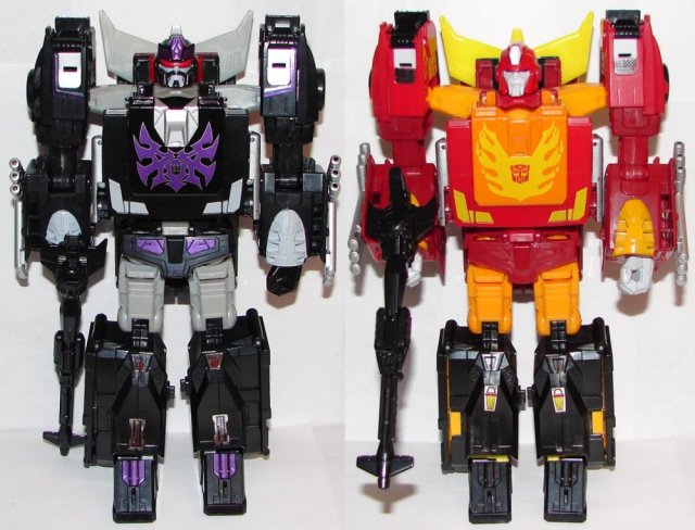 There are no mold changes on Nemesis Hot Rod. It is unfortunate that they didn’t give him a new head more similar to Rodimus Unicronus’s new head. He doesn’t look bad. I like that they didn’t just give him purple flames, but actually came up with new art for his chest. It actually looks better than Hot Rod. They didn’t outline Hot Rod’s flames, but they did outline the design on Rodimus Unicronus’s chest. Much better with the outline.