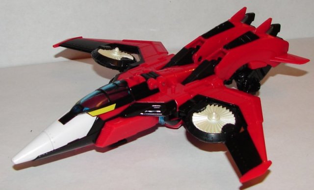 The paintjob on Windblade in a huge improvement over the USA version. I love the brighter red and white painted VTOL fans. Not sure I like the white on the jet nose, but it’s overall a much better looking toy than the USA version. The one thing that sucks is the sword. They used the sword from the first Generations Windblade toy. It has no way to attach to her in jet mode that doesn’t look completely stupid.