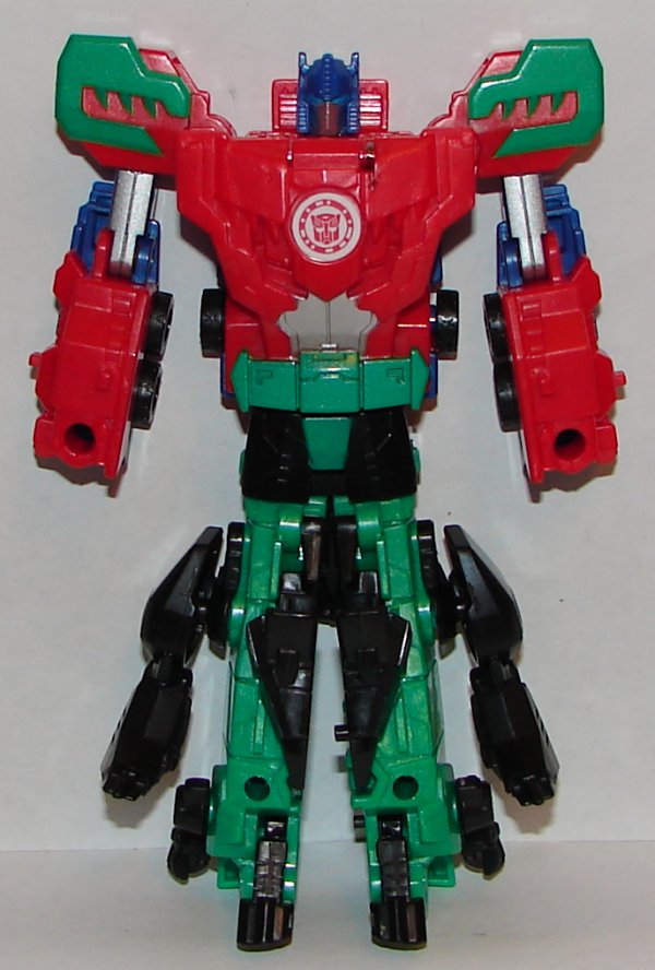 In addition to having new legs Primelock’s chest and shoulders have been remolded. He now has a dinosaur head and teeth silhouette on each shoulder. Pretty cool looking. His colors are perfect for Christmas.