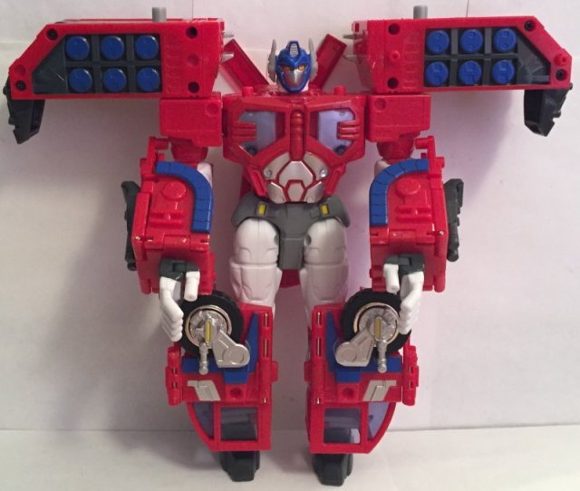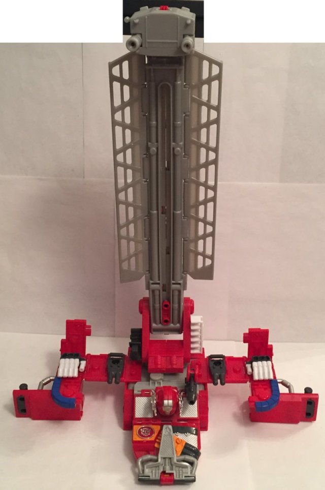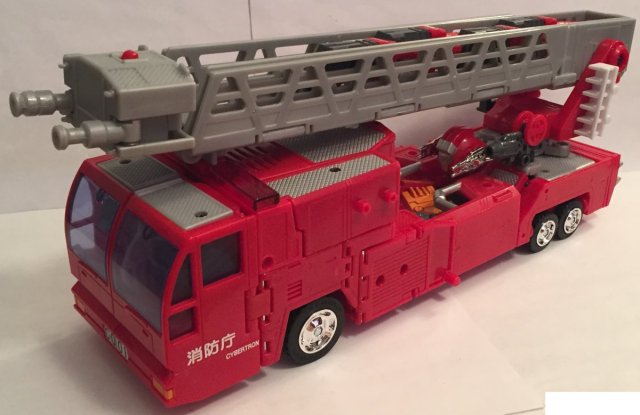 Fire Convoy is cast in a darker red plastic and brighter white plastic than the original. He also lacks the chrome on his chest. The lack of chrome seems to exposes screw holes and or mold flash on his chest. It’s not awful, but it makes him look cheap, when he was anything but. This is a really great toy. One of the molding issues is with his feet. In robot mode they seem fine, but in fire engine mode the panels on his cab roof don’t quite flip into place properly.