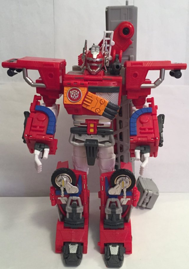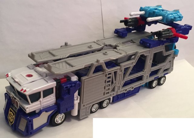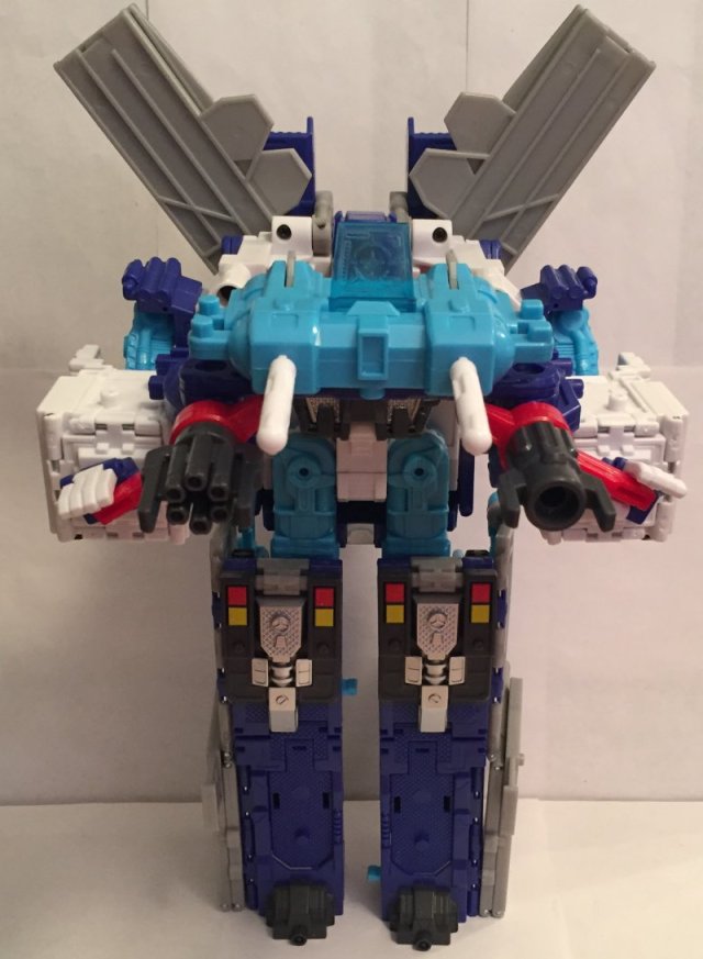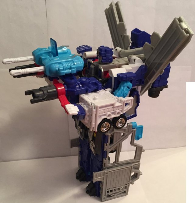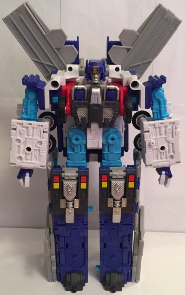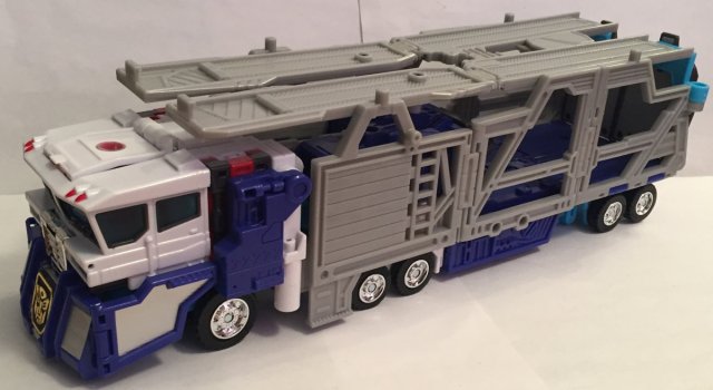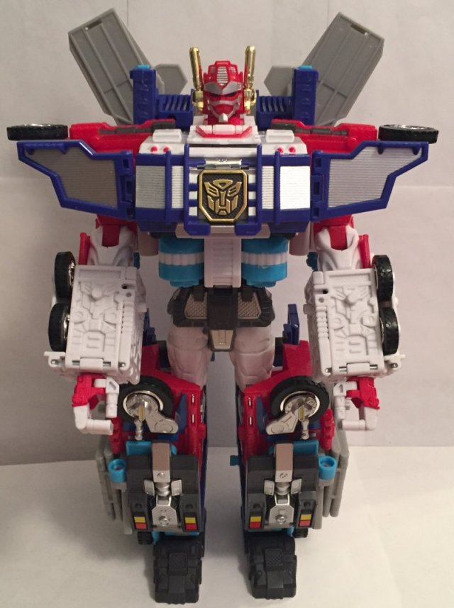 Like Fire Convoy, God Magnus is cast in darker blue plastic and brighter white plastic than the original. He looks great, if you ignore that this wasn’t a great toy in and of itself. His weapon is a ridiculous convoluted mess. It can be put in many configurations, but I didn’t bother. The main change on him besides the plastic colors is that he no longer has chrome on his bumper, except for the Autobot logo in the center.