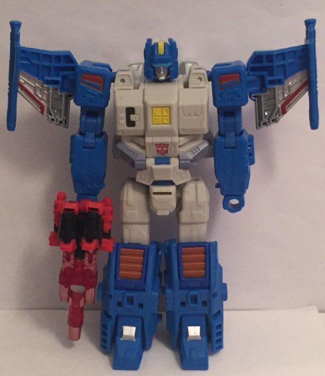 Legends Deluxe Topspin is repainted from Transformers: Generations Deluxe Windblade. Headmaster Topspin is repainted from Titan Master Freezeout. He comes with a new mold Targetmaster, Peaceman. Read my review of the Hasbro version of Topspin & Titan Master Freezeout.