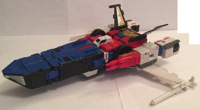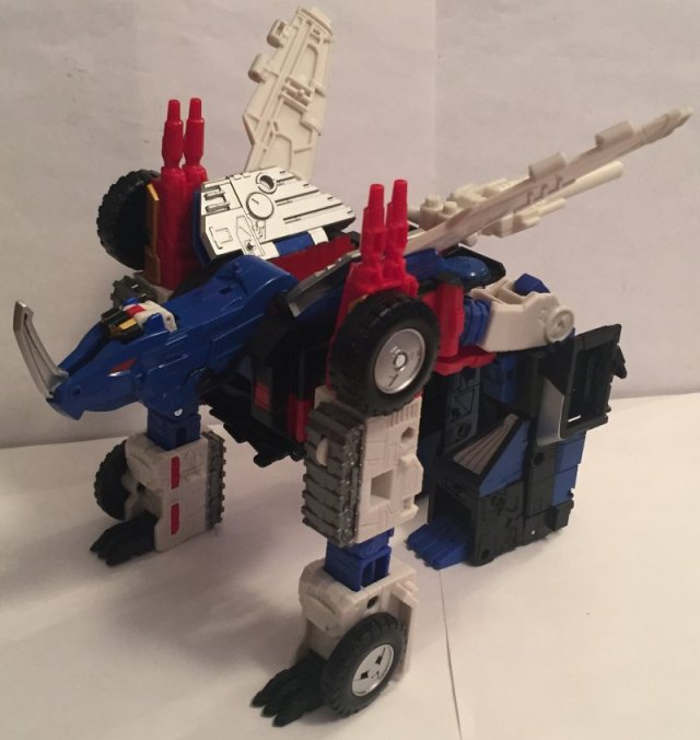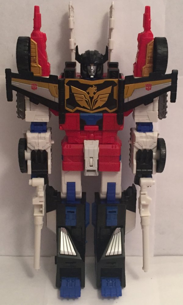 Greatshot looks awesome in red, white, blue, and silver. Aside from the obvious color changes, he has a few mold changes as well. His shoulders have been remolded into double cannons and Sixshot’s wolf head has been remolded into rhino’s head. The wings on the sides of his chest have been remolded, as has his chest. Lastly, he has a new helmet. You’ll note that it has horns. The horns actually fold inside the helmet when you take his headmaster out so you can flip it into his chest. This does mean that it is not possible to leave Jack in the helmet unless you aren’t flipping his head into his chest.