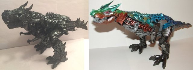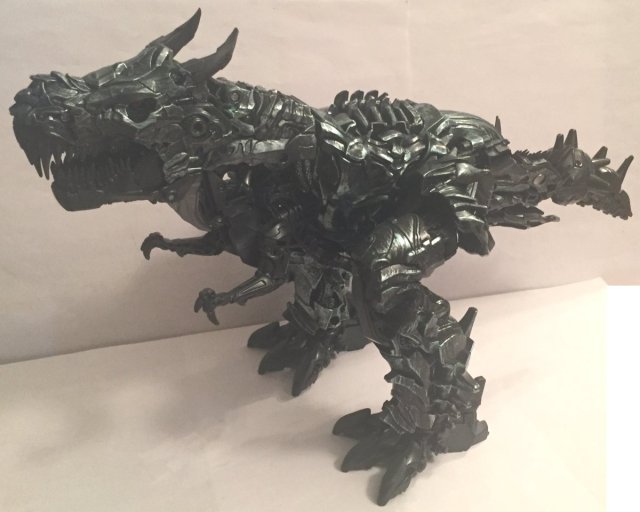 Dino Mode: It only took four years and way too many repaints of two awful molds (Leader and Voyager) but we finally have a truly awesome movie Grimlock. He looks amazing in tyrannosaurus rex mode. He is mostly black with weathered green-silver paint. He has the proportions of the Age of Extinction Voyager Grimlock with the detail of the Leader Class, and without the stupid long tail. He’s perfect.