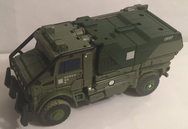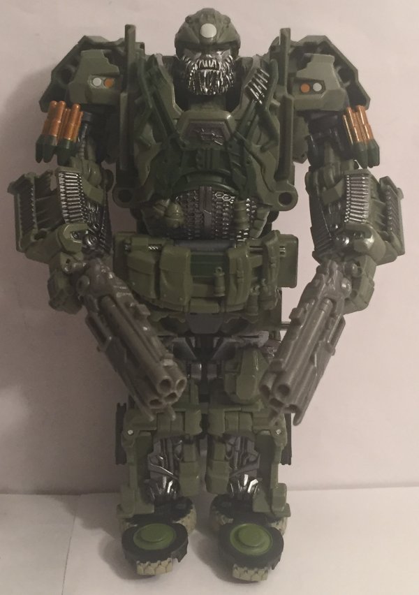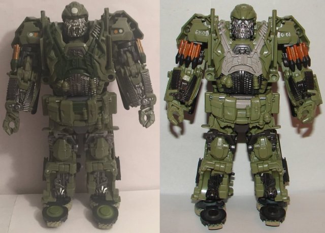 Movie the Best Hound is a repainted The Last Knight Voyager Hound without his weapons, and with a new shield/vehicle back and the weapons from Age of Extinction Hound (except for his knife). Movie the Best Hound has darker green plastic than the USA version. Many paint apps are different, but both look great. I love the back of the vehicle. It looks great, much better than the USA version. All the weapons, except for the big one can fit inside the back of the truck. The large weapon plugs in on the right side of the vehicle. In robot mode he can hold all the weapons, but he can’t hold them properly. The weapons were designed for Age of Extinction Voyager Hound, whose hands were angled forward. The weapon handles were not vertical, but slanted. Since The Last Knight Hound’s hands have standard vertical hand ports, the weapons point up at an angle in his hands.