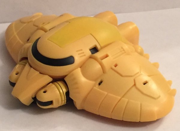 Bumblebee’s vehicle mode in More Than Meets The Eye, Part I looks different from scene to scene. In some scenes he looks more disk-shaped, but in others, he looks wider, like he has wings. This Bumblebee has the look of the latter version. It’s a really cool design. I wish he had a few more paint apps in vehicle. He looks pretty plain, but it’s a great design. In robot mode he doesn’t look anything like Bumblebee. In More Than Meets The Eye, Part I, even though their vehicle modes were different on Earth than on Cybertron, they looked the same in robot mode on Cybertron and Earth. Having said that, he does look pretty cool. I’m not crazy about the big shoulders. It would be better if they clipped into place. I don’t really like the face sculpt. It comes with a G1 toy version face, which looks much better. For some reason, they designed his head so that you need to remove the screw on the back of his head to swap the face.