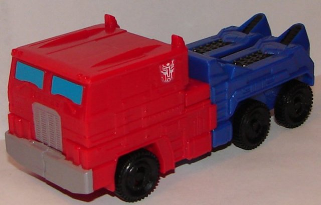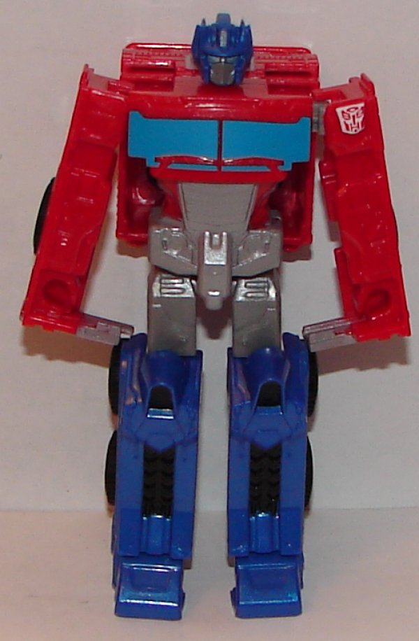 Optimus Prime’s head sculpt looks great. If only the bumpers protruding from the inside of his hands could flip down flat against his arms. His vehicle mode is not bad, but they failed to paint his side windows, which makes it look really odd.