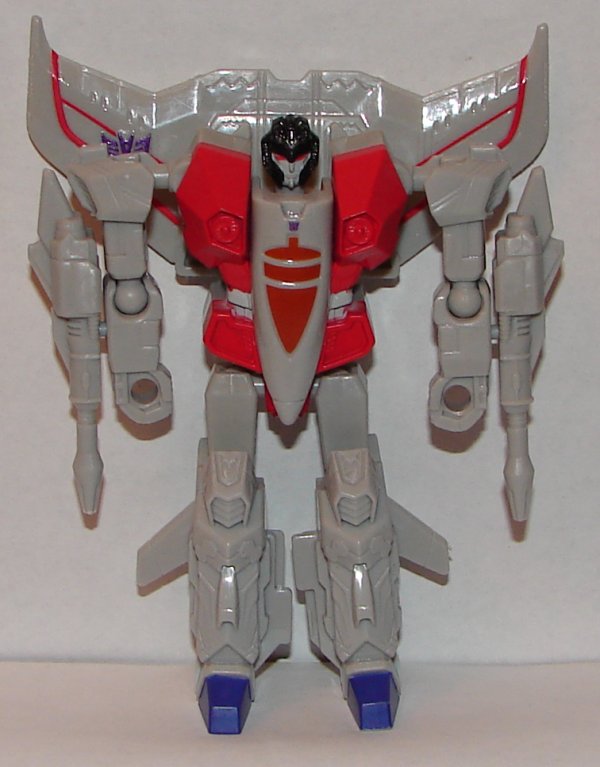 Starscream’s robot mode is pretty good. Could use a few more paint apps. I like his head sculpt, though it doesn’t really look like Starscream. His jet mode is a dumpster fire. His arms don’t completely fold in at his sides like they should, and his feet are sticking out the back of the jet. I’ve seen worse, but it’s just not good.