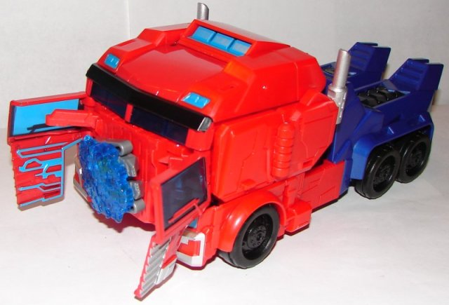 Vehicle Mode: I don’t dislike the design of the cab, but its very different from most Optimus Prime’s. I think he would have looked better with blue windows. He has an action feature, his chest pops open and reveals a spinning matrix.