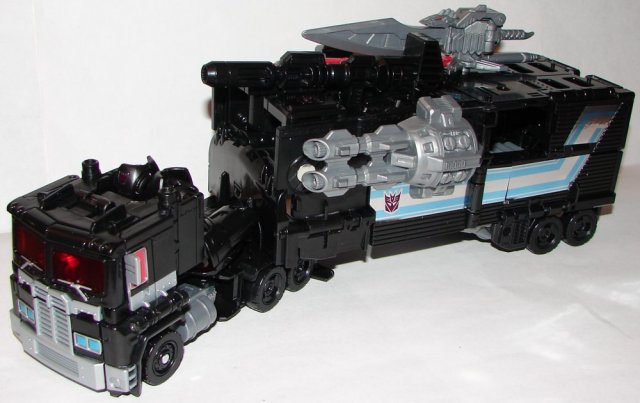 Nemesis Prime (and Nemesis Pax) have several new weapons, Giza, plus a non-transforming sword. He also has two double barrel cannons. He looks great, but as you can see in the picture, in order to attach the double barrel cannons to the sides of his trailer you need to open one of the trailer panels on each side. This is a fairly shortsighted design problem. I swear Hasbro rarely thinks ahead on things like this. It would have been easy to just put a port on each side of the truck.