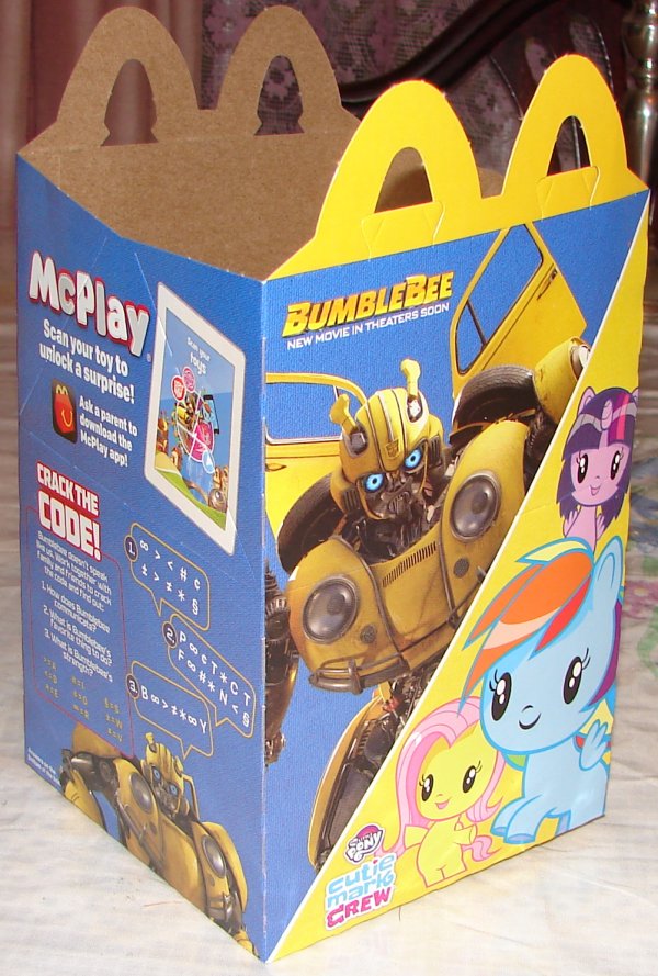 This is the American McDonald’s box. It’s clearly a Bumblebee movie item. The toys are obviously based on Cyberverse or Evergreen designs, but don’t say that on their packaging. So I’m considering the toys under Transformers 2018 for lack of anything better.
