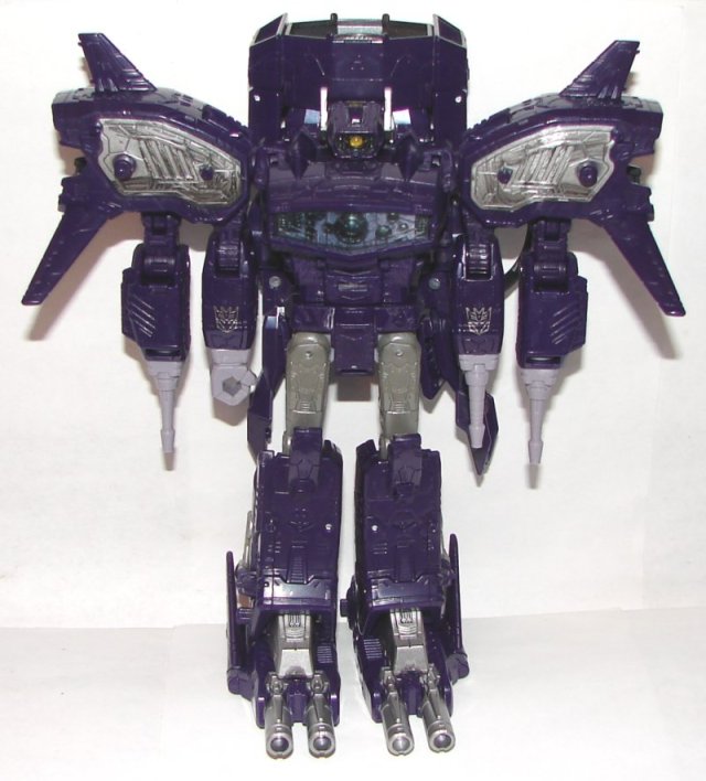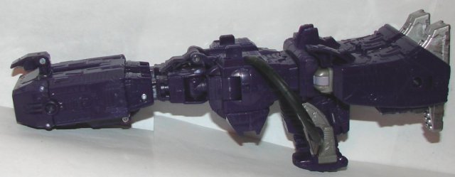 Vehicle Mode: I don’t know what Shockwave’s smaller vehicle mode is supposed to be. Space ship, submarine. Whatever it is, it’s anything but the laser gun it’s meant to be. It’s fine, about what you’d expect when turning Shockwave’s gun mode upside down. When you add on his additional pieces, then he really becomes a pretty cool space ship. I like the design. The dark purple, silver, and gray is appropriate for the character, but as a space ship, he really could have used a few more silver paint apps to give him some color. Traditionally the muzzle of Shockwave’s gun barrel is gray or silver. I think I would have preferred that to making it purple.