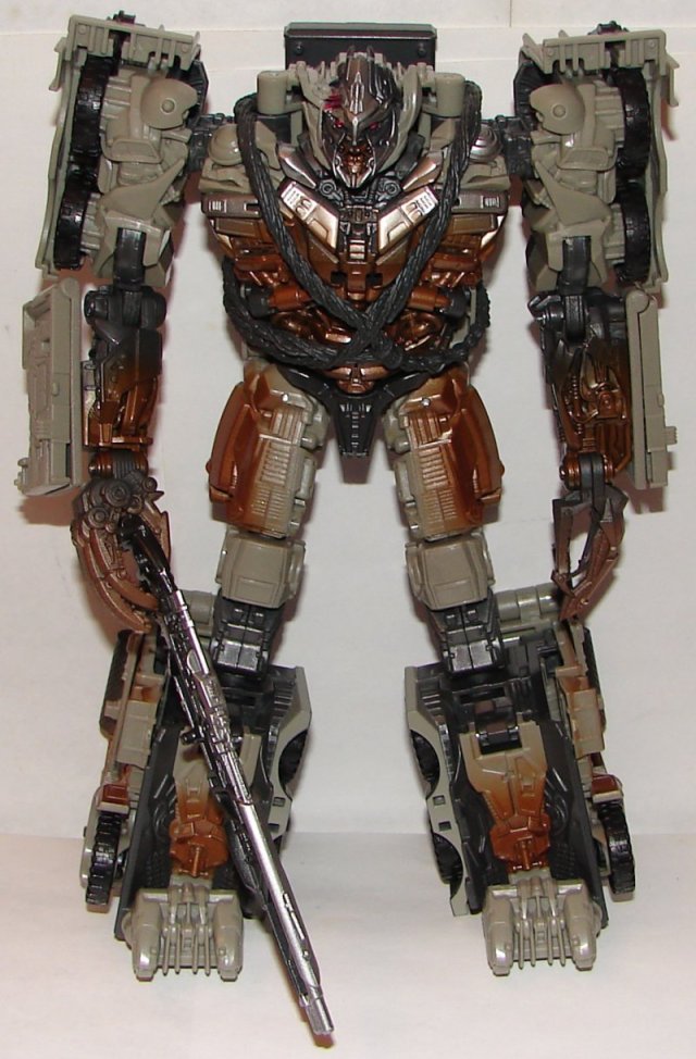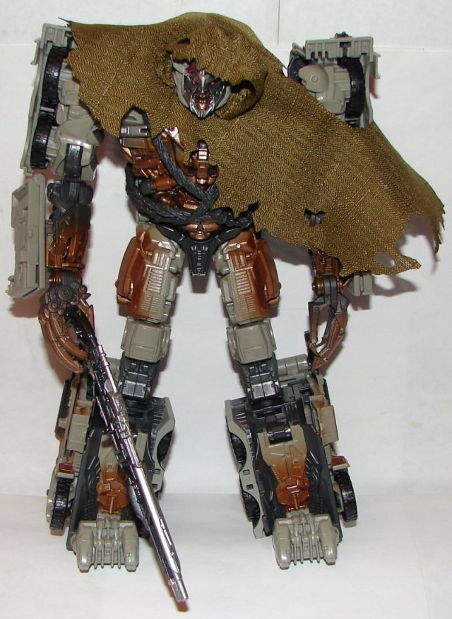 Robot Mode: In robot mode Megatron is also amazing. His molded details, paint apps, and his battle damaged head sculpt are all perfect. Again, the only real complaint is the tarp. His hood is too big. You can’t put it on so it just shadows his face. It either covers it, or you pull it back behind his head. I tried to put it on the right way, and it just doesn’t look right no matter what I do. If you wanted to sew it onto him you could probably get it to look right, but I’m not about to do that.