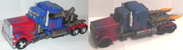 Optimus Prime has been heavily remolded, so much so, that until I looked at them side by side I thought it was a completely new mold. They have remolded as much as they kept. You can see in his forearms and legs that he is the same base old as the Revenge of the Fallen version. This version is supposed to be for the 2007 movie. In robot mode he has a new chest and upper abdomen. The outsides of his lower legs are different, his shoulders are new, and as you can see from the wheels on his hips, even the way they transform is different. He also has a new “backpack”. Considering all the remolding, while the parts and seams are different he is pretty much the same truck. The only major difference is his fuel tanks and some kibble on the sides of the vehicle behind his front fenders. I like the brighter paint job better than the original, and he has a new weapon that is based on his “buster” weapon first included with the Takara Revenge of the Fallen Leader Class Buster Optimus Prime and most of it’s repaints and remolds. What is really strange about this toy is that, while it is supposed to be the 2007 Movie version, it is meant to celebrate the 10th anniversary of Revenge of the Fallen. That it includes he Revenge of the Fallen gun is certainly one way in which that makes sense. The other is that he can combine with Studio Series Leader Jetfire to make Jetpower Optimus Prime. Read my review of Studio Series Jetpower Optimus Prime.