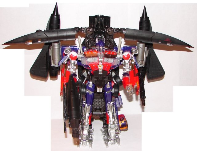 When Hasbro fails, they fail hard. The toy is way too top heavy, and Optimus Prime’s arm joints are not capable of holding up his gun. Speaking of the gun, Hasbro neglected to include how to transform it in the instructions, so technically, there is no gun mode for the other half of Jetfire. It’s just…extra. It’s crap anyway. His arms don’t peg in properly on the bottom of the gun. Combining a Voyager Optimus Prime with a Leader Class Jetfire just doesn’t make sense. Above he is pictured with Takara Revenge of the Fallen Jetpower Optimus Prime. It is superior in every singe way.